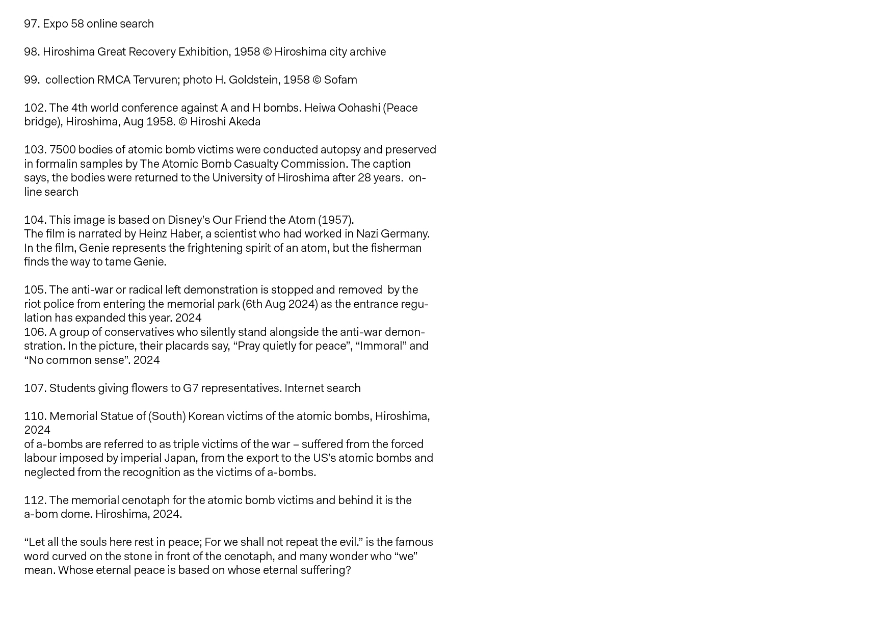 ヨーロッパの戦後開発においてコンゴは逆説的に、可視された存在でもあり、不可視化された存在でもあった。コンゴの重要性は米国と欧州の利害の気まぐれによって形作られた。この植民地主義者達の矛盾論法は、マンハッタン計画後も明らかで、例えば、1958年のブリュッセル万国博覧会(Expo 58)では、植民地の学術人類館が依然として行われていた。コンゴセクションという一帯が設けられ、原子テクノロジーを祝うパビリオンや、ウラン鉱石を展示した植民地政策のプロパガンダが行われる中、コンゴの人々は、アトミウムタワーのそばに建てられた伝統的なコンゴの家屋を模した村で展示されていた。一方日本では、原爆生存者は残留放射線の科学的研究材料として利用され、占領軍のリサーチセンター(ABCC)によって、再度非人間化された。同時に被爆者達は、原子力の平和利用(Atoms for Peace)のキャンペーンの中、戦後まもなくすぐ行われた平和祭典や、1958年の広島復興大博覧会のようなフォーラムを通じて、日本全国に原子力を推進する立場に置かれた。本作品は、近代性と平和の美学の背後にあるメカニズムを解体しよう