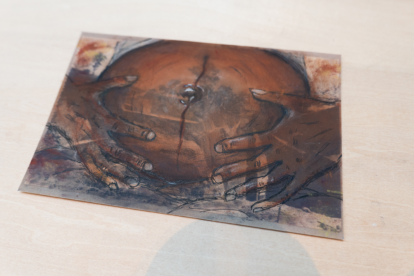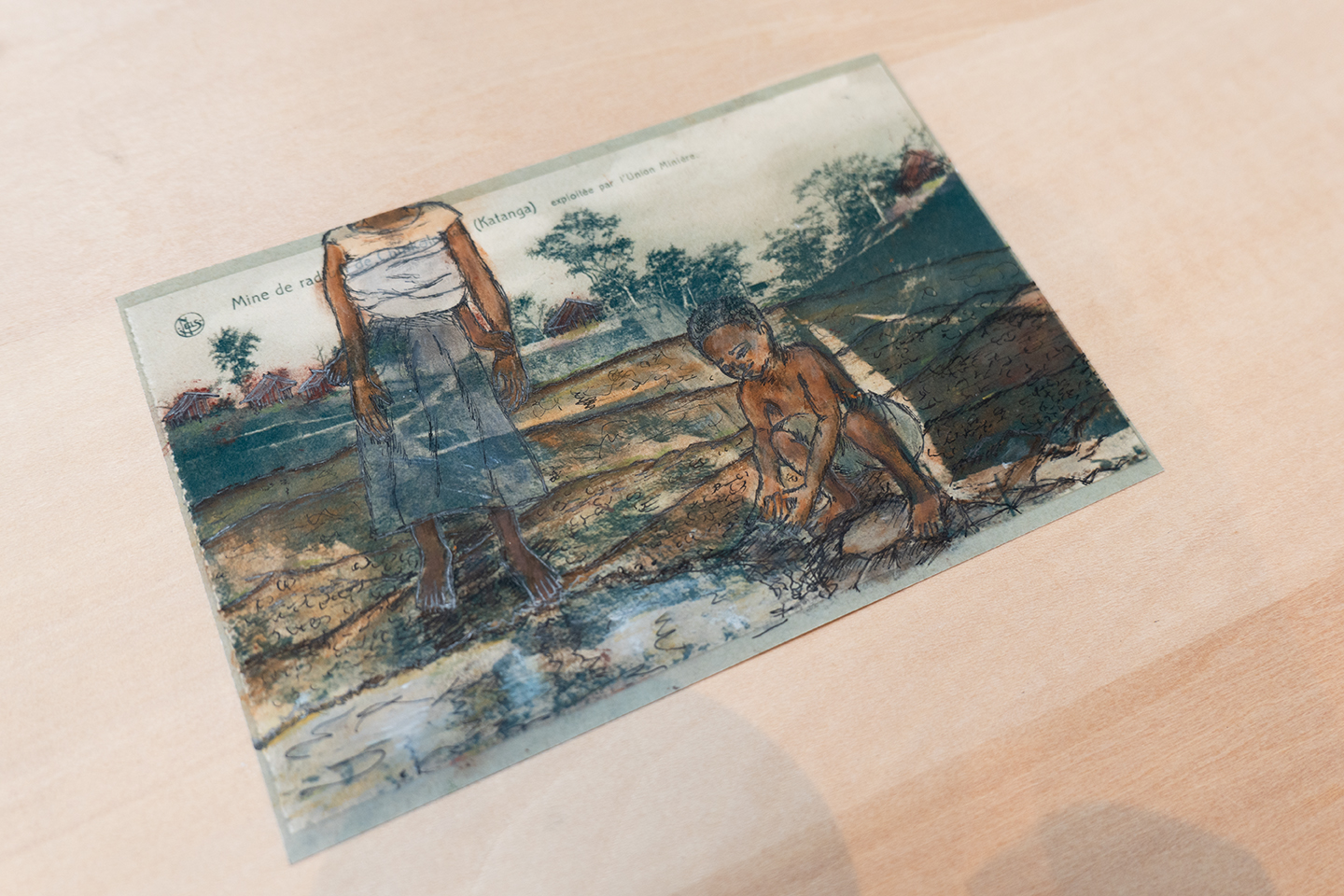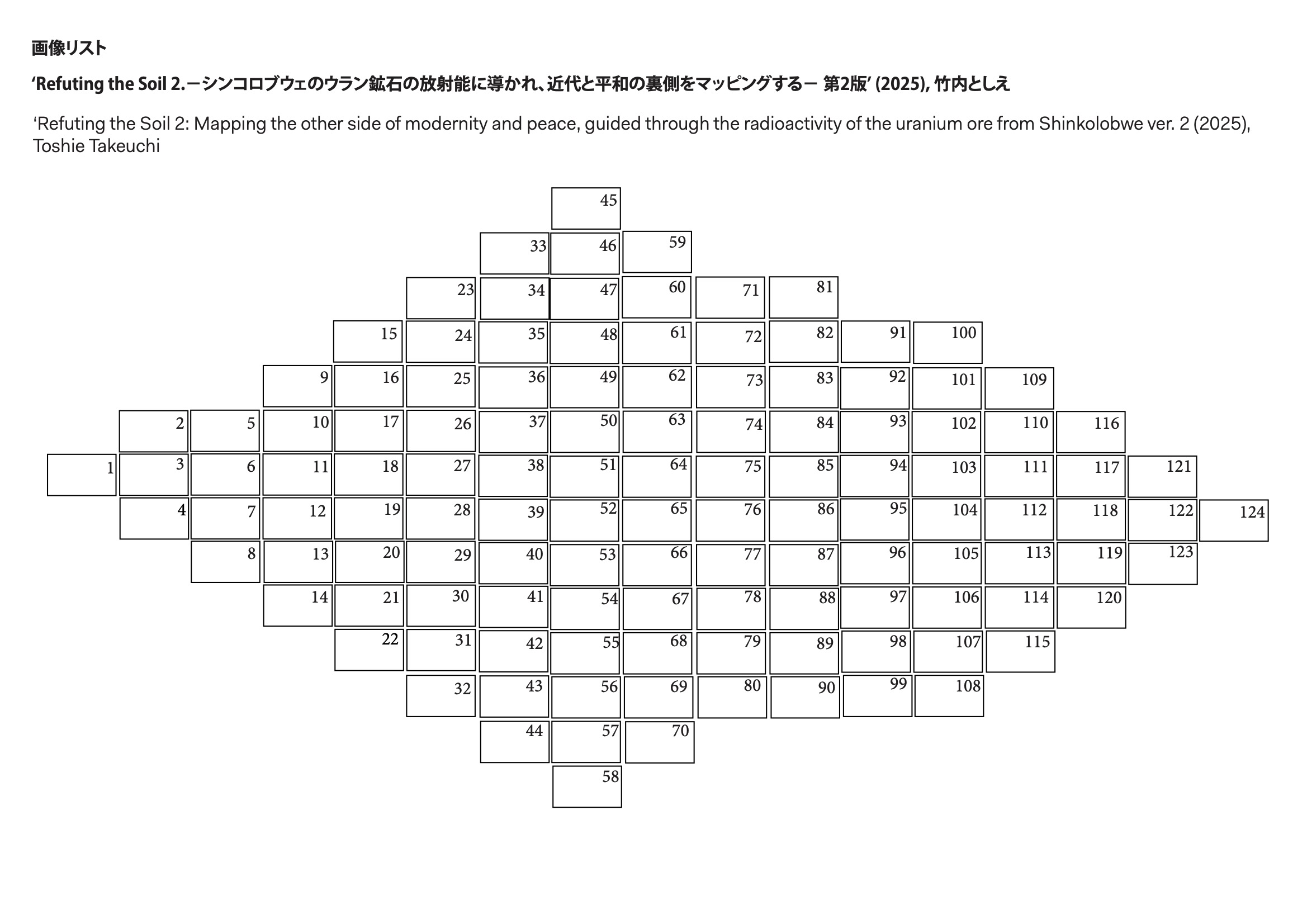 本インスタレーションは、『’Refuting the Soil 2.-シンコロブウェのウラン鉱石の放射能に導かれ、近代と平和の裏側をマッピングする』は、歴史的アーカイブ、衛星アーカイブと共に、作家自身が制作した写真やドローイングを組み合わせた129枚のポストカードサイズの画像から構成される。(組み合わせや枚数はバージョンによって異なる。)作品は、コンゴ民主共和国、日本、アメリカの3人のアーティストによるコラボレーション『シンコロブウェ:権力と記憶のはざま』の一部。核史最初期の原爆開発に使われたウランの主要供給源、コンゴのシンコロブウェ鉱山を主題とした芸術的対話、グループ展である。(プジェクト全体の概要はこちらから)