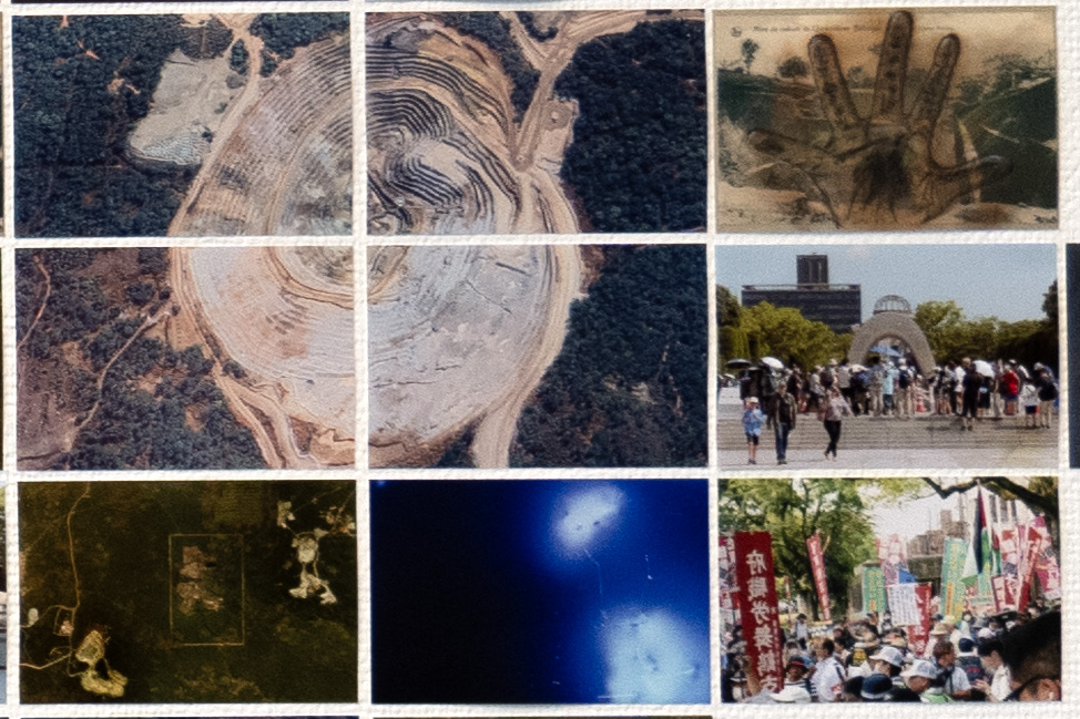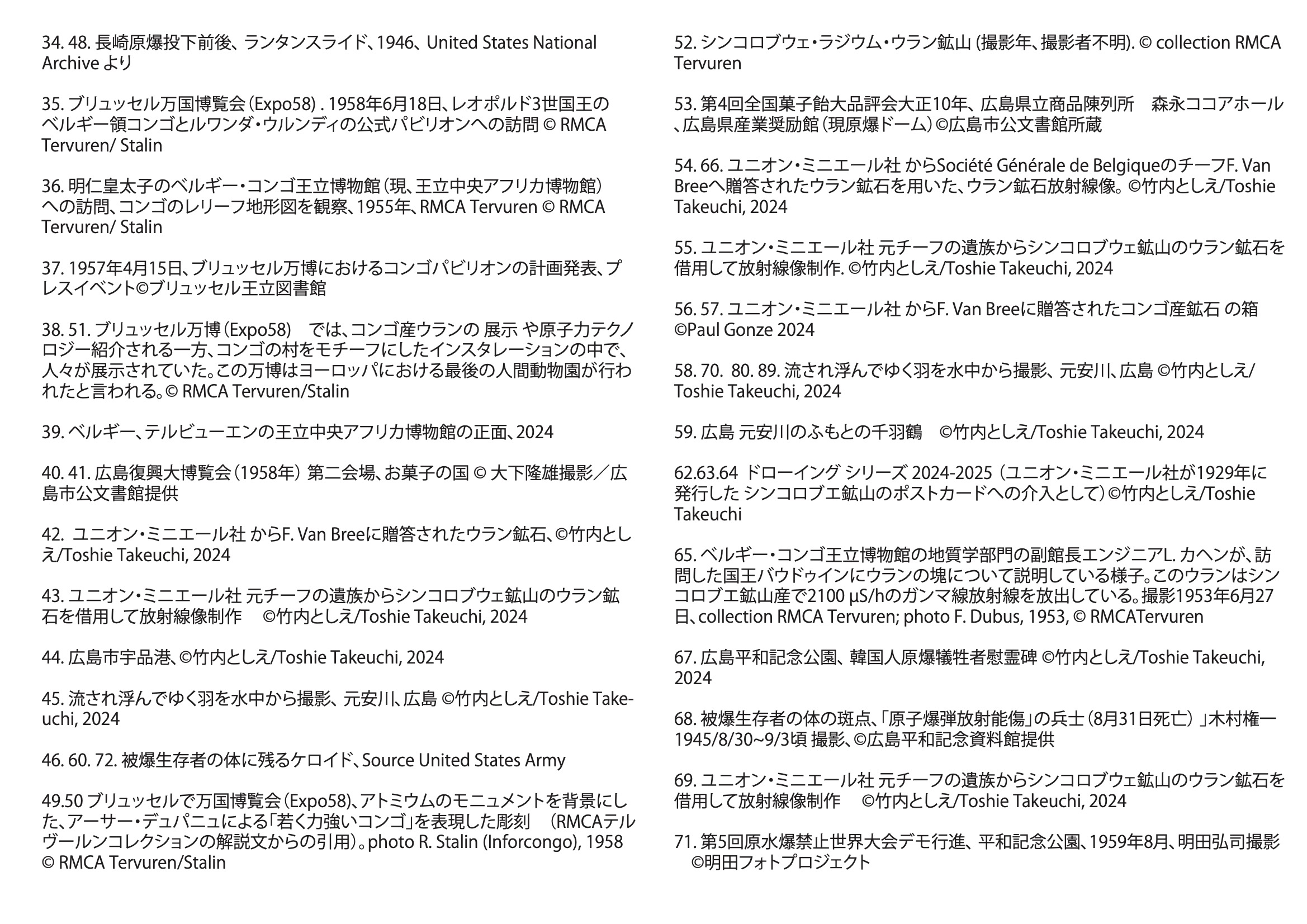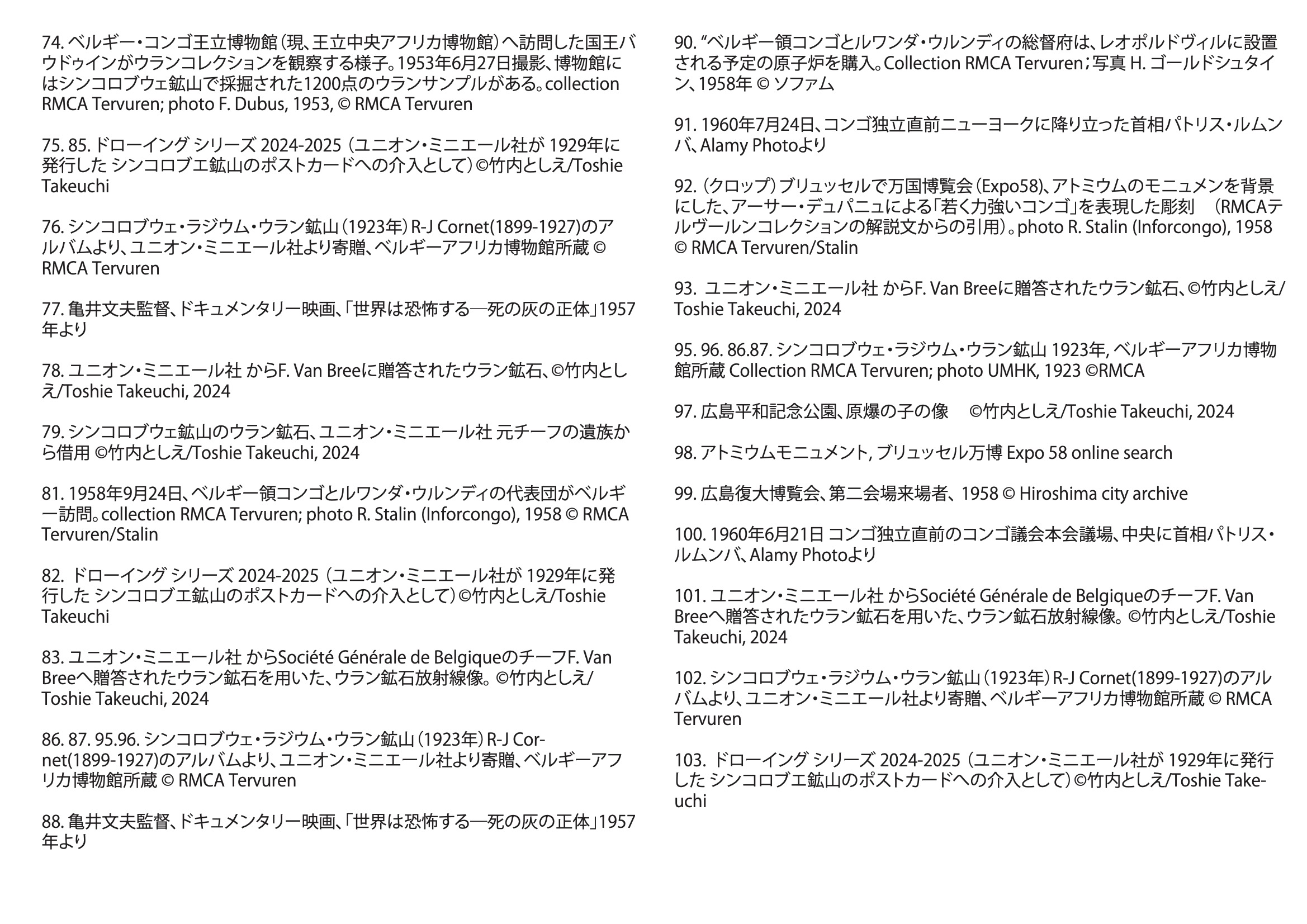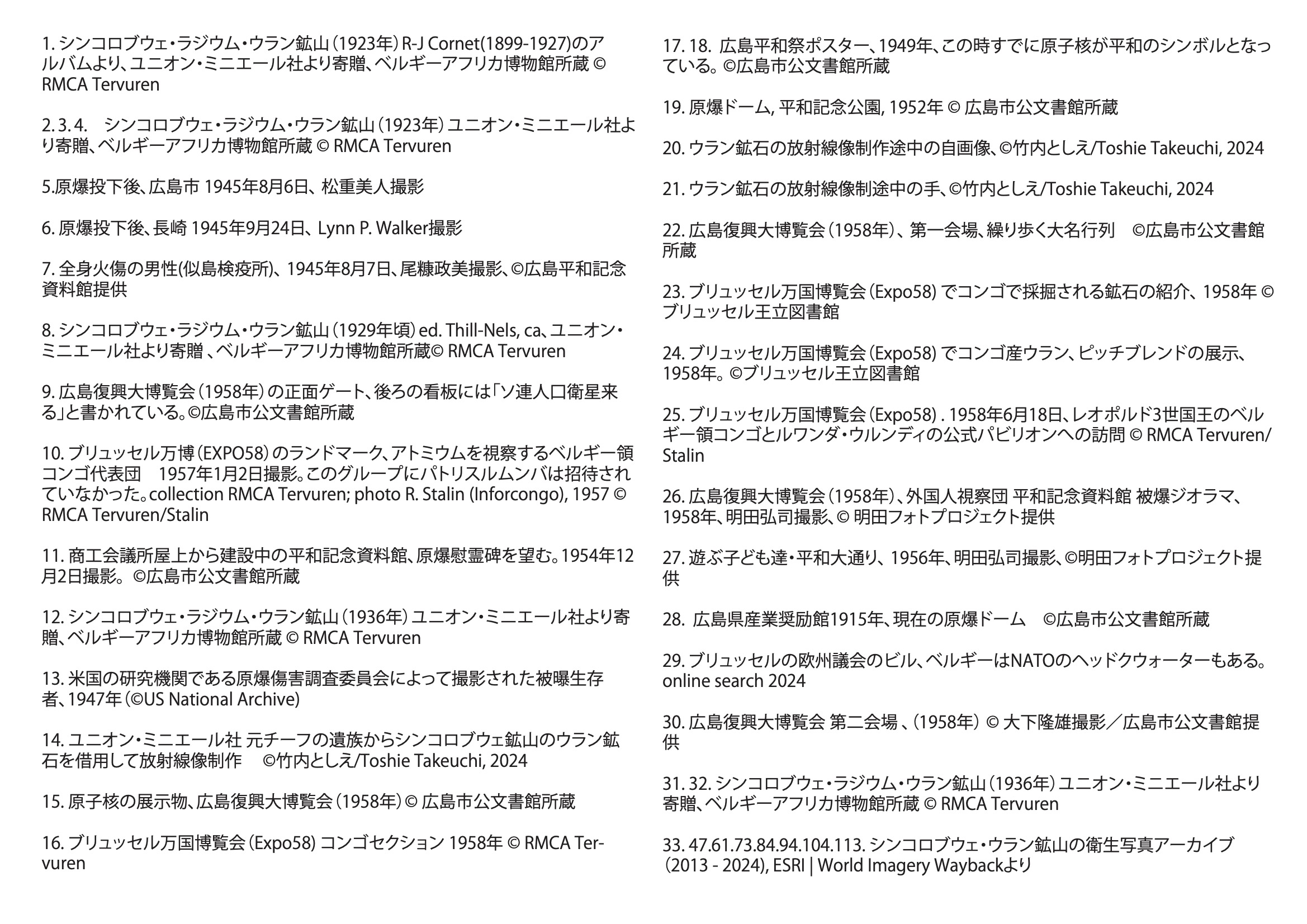 シンコロブウェ鉱山のウラン鉱石の放射線像。そのウラン鉱石の写真、広島でのフィールドリサーチの写真。1923年にミニオン・ミニエール社が発行した、シンコロブウェ鉱山のポストカードに描かれたドローイングシリーズ。次の提供団体による歴史的アーカイブ写真も含む: Collection RMCA Tervuren (ベルギー王立アフリカ博物館), RMCA Tervuren/Stalin (ベルギー王立アフリカ博物館/Stalin), Sofam (ベルギー王立アフリカ博物館/Sofam), Brussels Royal Library (ベルギー王立図書館), 明田弘司/明田フォトプロジェクト, 広島市公文書館, 広島平和博物館, United States Army (米軍資料)。2014−2024年の鉱山周辺の衛星画像アーカイブは、Google(グーグル)とESRI | World Imagery Wayback (ESRI | 世界の画像アーカイブ)の画像を使用。